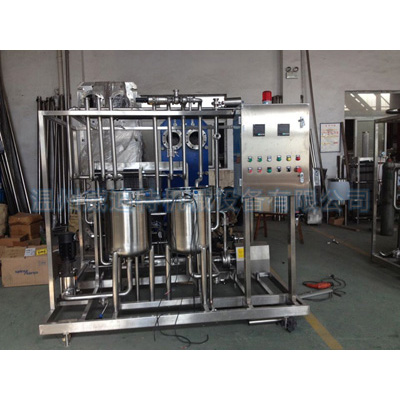 果汁饮料板式灭菌设备的产品组成及特点:灭菌机由板式灭菌器、物料泵、热水泵、平衡罐、自控仪表、管道和阀门等组成的撬装机组。
